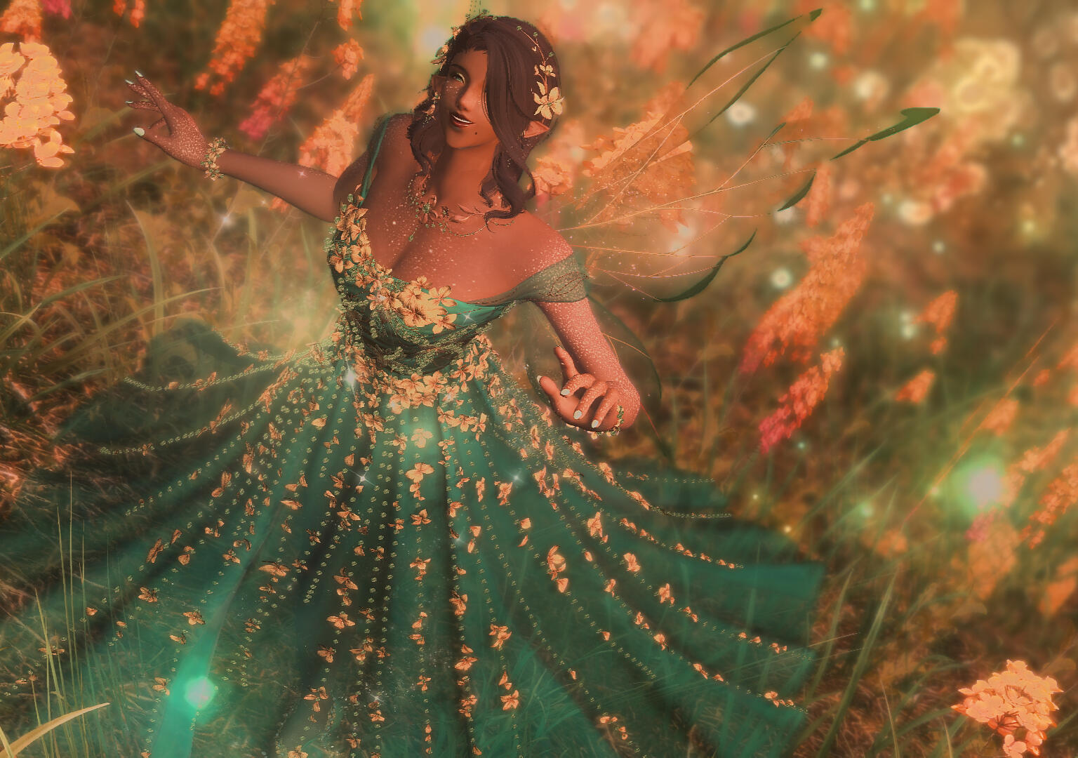 ⋆˙⟡ As the faerie reaches a clearing beyond her precious gardenias, her gilded gown drags along the soil and leaves new blooms in its wake. They swiftly rise to greet their mother, dainty petals parting as though to smile at her with a warmth akin to the sun's gentle rays. ✧˖°.